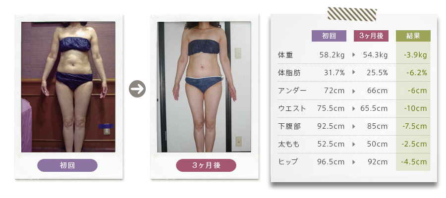 子供の手が離れて、やっと自分に使える時間が増えた50代。気がつけば脂肪だらけの体をまず正そうと思い、サンパティックに決めました。 ぶよぶよ、そしてぽっこり出たお腹がみるみるへこむのが実感できました。ヒップ、太ももも順調に細くなり、下半身痩せに成功できました!!