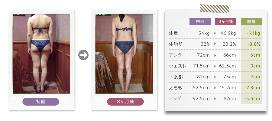 30代前半で出産して10kg近く太ってしまい、戻らなく困っていました。 ひどいときは後ろ姿がたくましすぎて、男性に間違われることも(涙)。 サンパティックでの施術後は、目標体重もクリアできて、スタイルも20代の頃と同じくらいになれて満足しています。